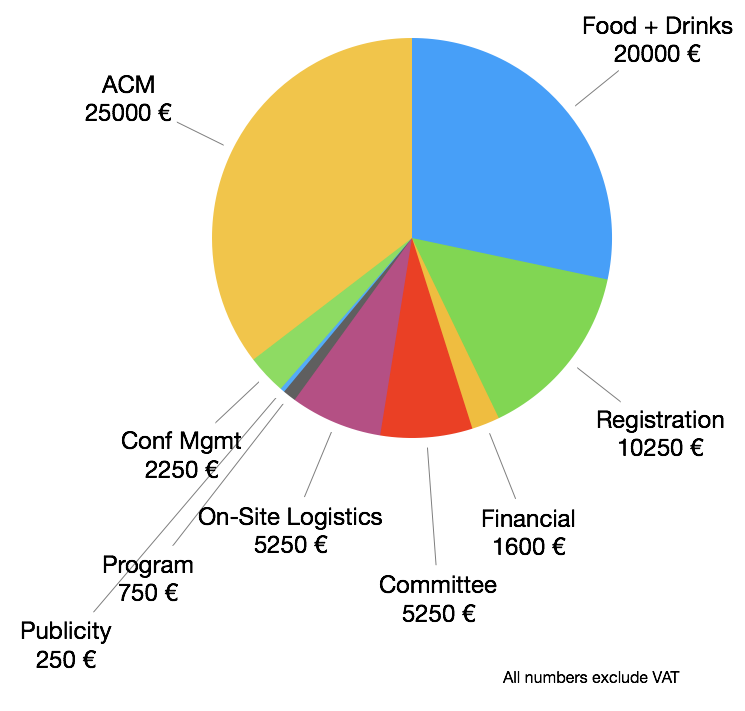 Of course, you do not know how many people will attend, so you calculate conservatively – I estimated 100+ visitors for the main conference, and planned accordingly. The key point in planning, though, is the expenses. This is what the expenses for ISSTA 2016 eventually broke down to: